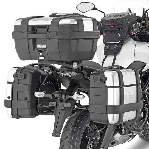 The side case holder is compatible with all models in the Givi Monokey Side Case range except the GIVI V35 Monokey Side Case. All parts needed to mount the PL4114 are included. It can be mounted without the specific rear rack SR4114 using the 4114KIT / To ensure the best visibility of the rear indicators mounted with the cases, you need to relocate them by using kit IN4114KIT.
