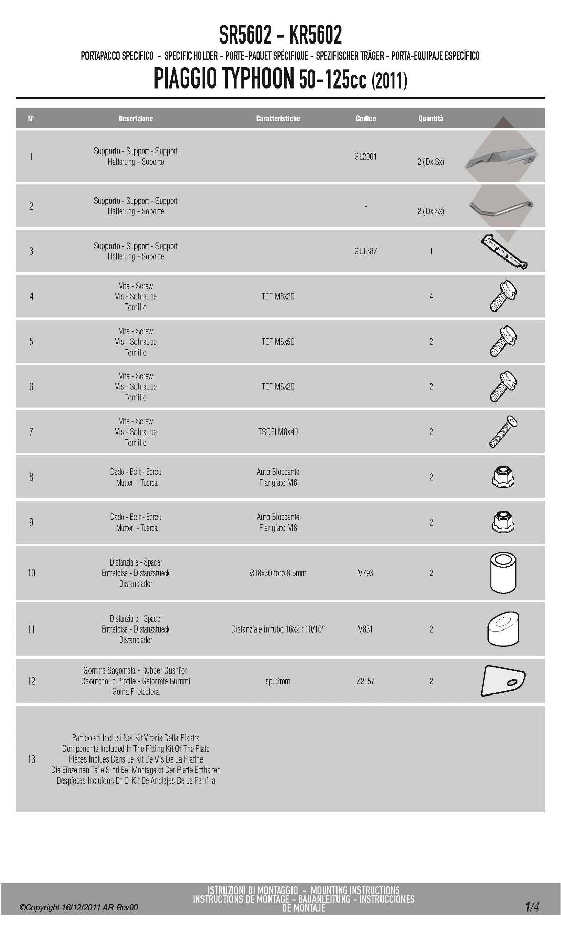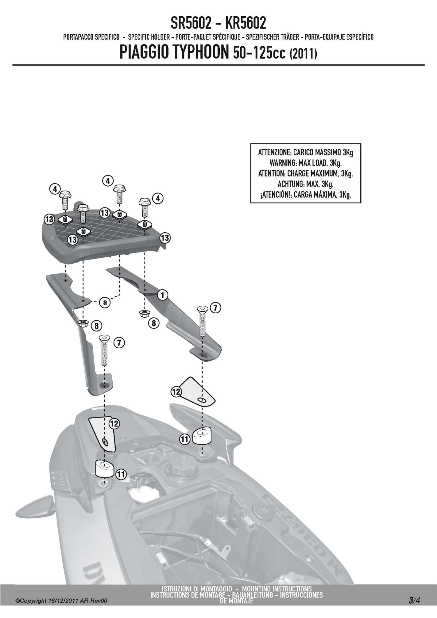 GIVI’s SR5602 Specific Rack is made specifically for Piaggio Typhoon 50-125 (2011-current).This rack will take GIVI Monolock top boxes only. The rack is srong, functional, and well-tested. All parts needed to mount the Givi SR5602 rack are included. Installs quickly using simple hand tools. No welding or cutting of existing frame or body parts required, The GIVI SR5602 rack does not include a Monolock base plate, use the universal Monolock base plate which comes with the Monolock top box of your choice. Please note: maximum load allowed 3Kg.