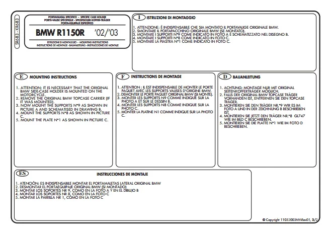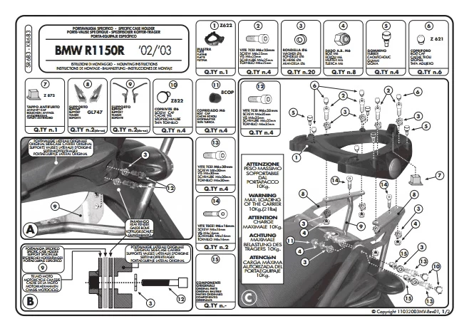 GIVI SR683 Rear Plate is a bike specific rear plate kit for a BMW R 1150 R, The kit is designed to take GIVI Monokey Top Boxes only. All parts needed to mount the GIVI SR683 Rear Plate are included. Installs using simple hand tools Complete with GIVI M5 Monokey plate, it can be mounted with the original side case holder. Maximum load allowed 6 kg