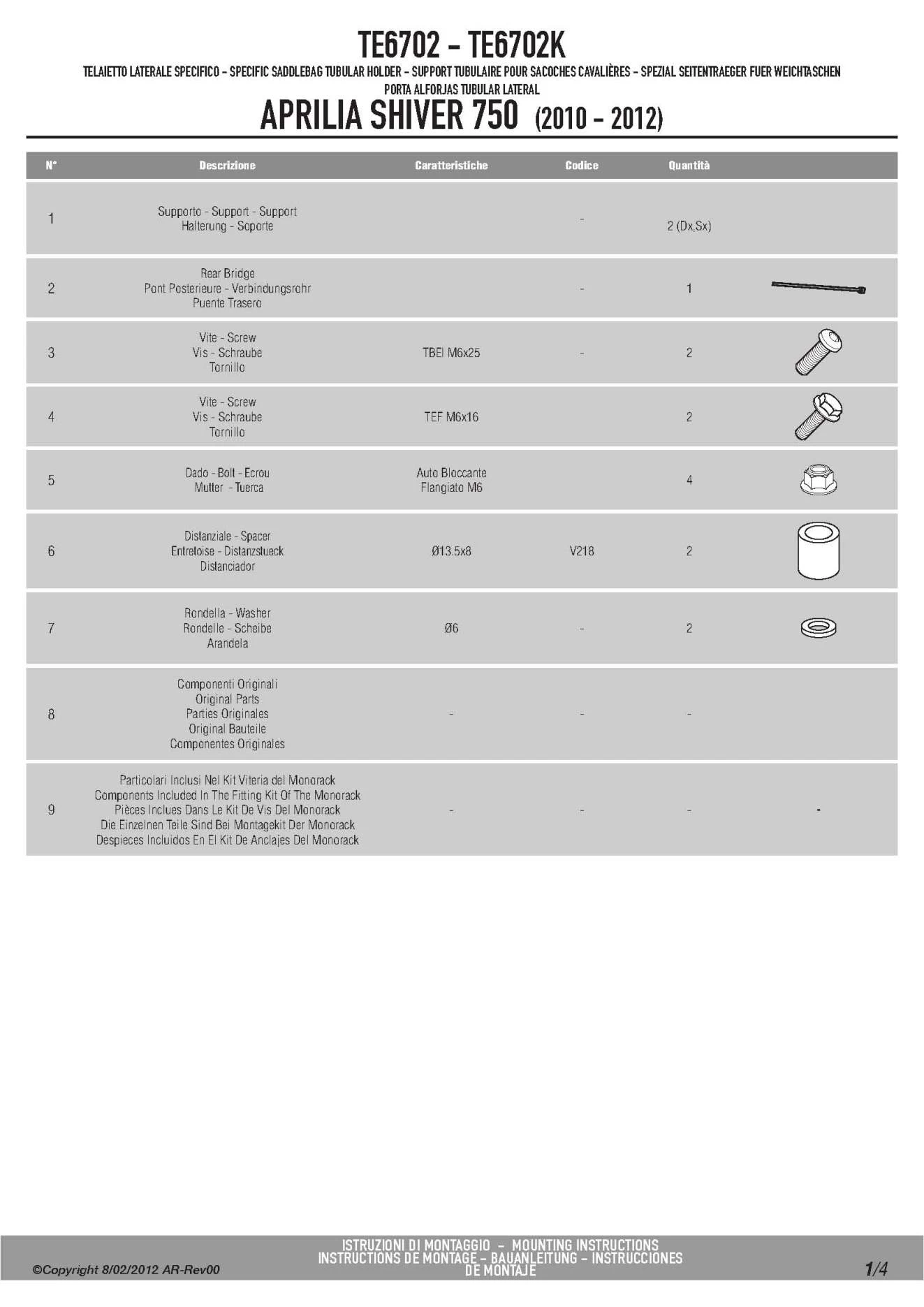 GIVI’s TE6702 Easylock Saddlebag Support is made specifically for Aprilia Shiver 750 (2010-current). The TE6702 Pannier Holder is designed to take GIVI Easylock Bags, it can also be used to take soft luggage side bags. The TE6702 easylock carrier can be fitted regardless whether a top box is fitted or not.